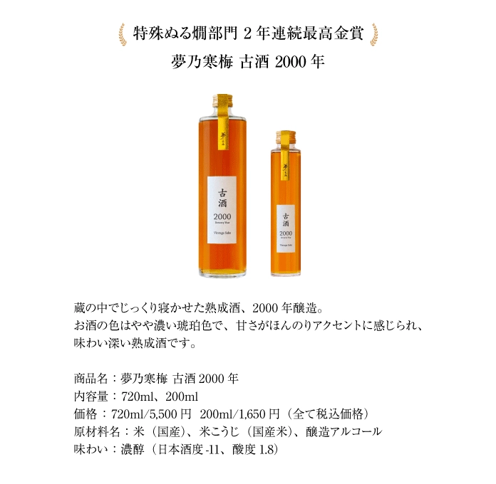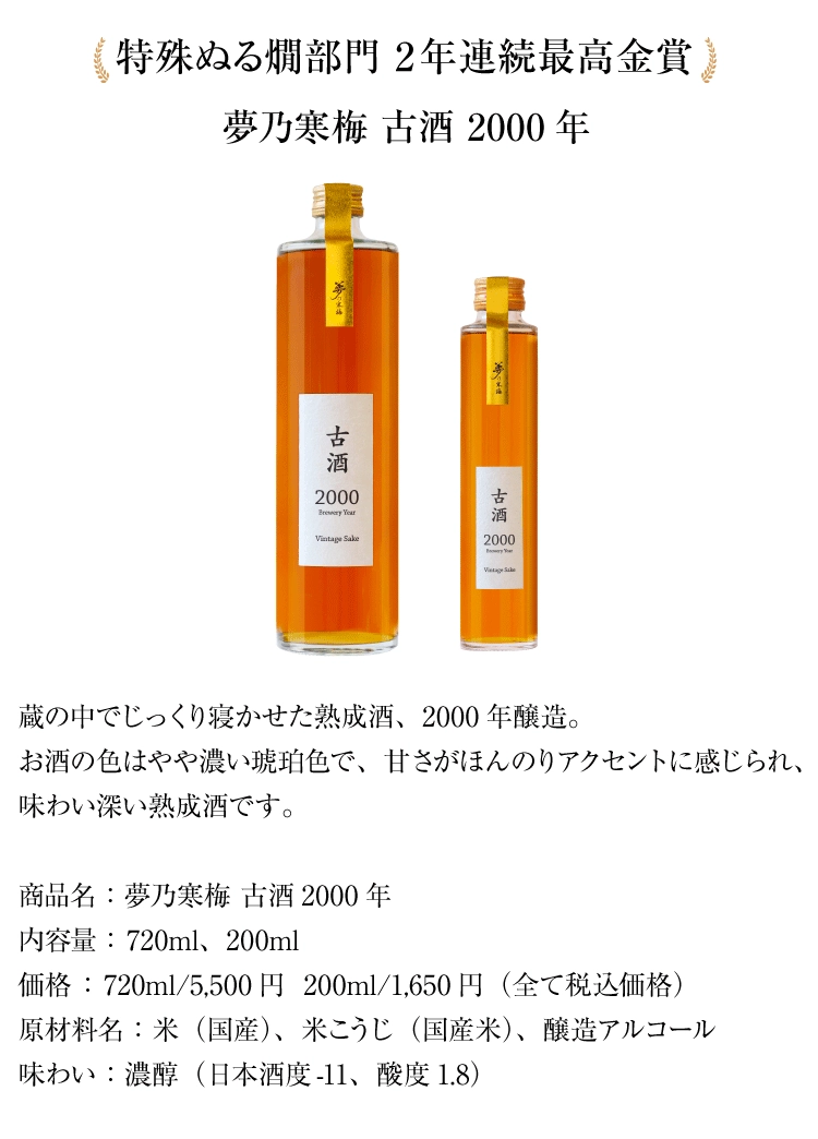 全国燗酒コンテスト2022、特殊ぬる燗部門で「夢乃寒梅 古酒 2000年」が最高金賞を受賞しました。昨年に引き続き2年連続での受賞となります。